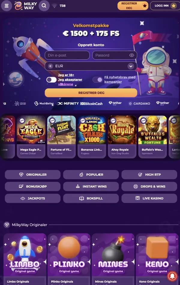 For Norge-tilpassede betalinger støtter vi EUR-innskudd og EUR-uttak med tydelige grenser og typiske behandlingstider. Hvis du foretrekker kort eller e-lommebøker, kan du velge alternativer som Visa, Mastercard, Skrill eller Neteller. Hvis du foretrekker kryptovaluta, er BTC og LTC tilgjengelig for innskudd, og uttak inkluderer også ETH og USDT, som mange spillere bruker for hastighet og fleksibilitet hos MilkyWayCasino.